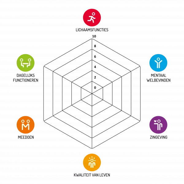 Die brede invulling van gezondheid, is uitgewerkt in zes dimensies. Die zijn voortgekomen uit onderzoek naar wat mensen zelf verstaan onder gezondheid. Zij blijken niet alleen lichamelijke gezondheid belangrijk te vinden, maar bijvoorbeeld ook zingeving, meedoen en kwaliteit van leven. Het spinnenweb diagram beschrijft de zes dimensies en bijbehorende aspecten. Met het spinnenweb kunnen mensen hun eigen gezondheid in kaart brengen. Ook is het een instrument dat kan worden ingezet als opmaat naar een gesprek over gezondheid en welzijn.